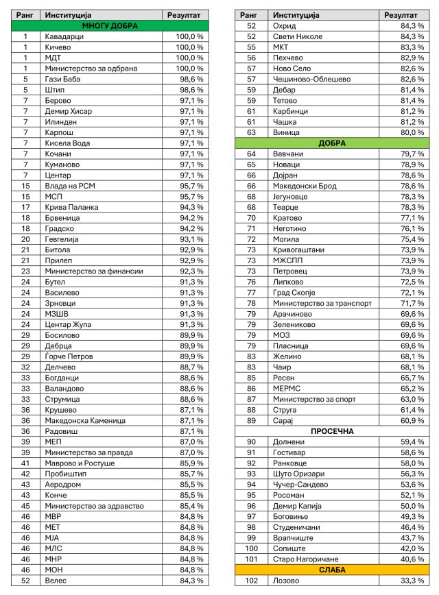 - Министерството за одбрана, петта година по ред ги задржа максималните 100 % активна транспарентност, а резултатот од 100 % годинава го освои и новоформираното Министерство за дигитална трансформација.