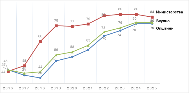 - Просечната активна транспарентност на министерствата, на Владата и на општините за 2025 година изнесува 80 % (од максимално можни 100 %), исто колку што изнесуваше и минатата година.