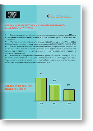 ВестиБриф за главните карактеристики на јавните набавки во Македонија25/12/20187791Сумирани информации за главните карактеристики на јавните набавки во земјава за 2017/2018, борбата против корупцијата во јавните набавки, како и споредбени показатели и трендови за земјите од регионот Број на прегледи: 7.791 претходен Извештај во сенка за јавните набавки: Меѓу старото и новото следен Извештај во сенка за состојбите, проблемите и идните предизвици во спроведувањето на тендерите во Македонија
