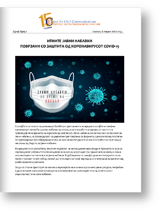 Центарот за граѓански комуникации ги следи итните набавки поврзани со новиот коронавирус за навремено да детектира одредени слабости во процесот и да даде придонес кон нивно надминување, а со цел рационално искористување на ограничените јавни ресурси во земјава.