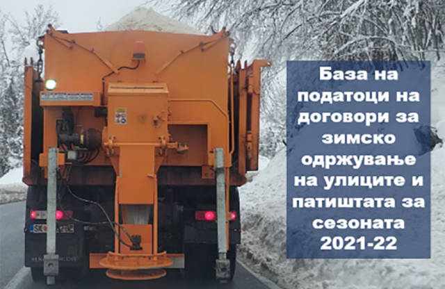Државните институции склучиле договори за јавни набавки со приватни фирми за механизација, работници, сол и ризла за одржување на улиците и патиштата во зимски услови за сезоната 2021-2022 година во вредност од половина милијарда денари (8 милиони евра). Линк до истражувањето и базата на податоци на договорите на државните институции со приватни фирми за зимско одржување на улиците и патиштата за сезоната 2021-22.