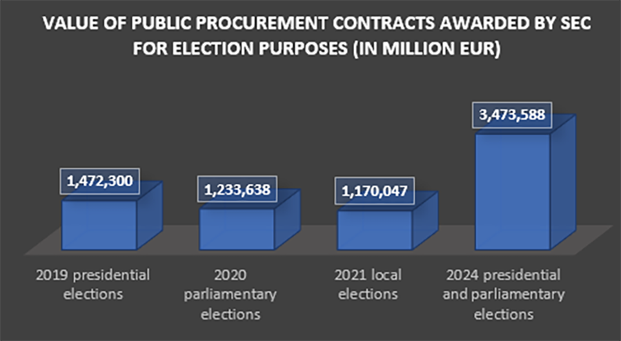 – Tender procedures organized by SEC and related to this year’s joint presidential and parliamentary elections have costed by 767 thousand EUR more than the sum of all tenders for the same type of elections held individually in 2019 and 2020.