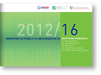 СКОПЈЕ, 14 мај 2013 година – Центарот за граѓански комуникации денеска ги објави резултатите од мониторингот на постапките за јавни набавки во Македонија кој го опфаќа периодот од октомври до декември 2012 година. Некои од клучните наоди се: