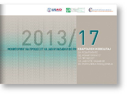 СКОПЈЕ, 30 Август 2013 година – Центарот за граѓански комуникации денеска ги објави резултатите од мониторингот на постапките за јавни набавки во Македонија кој го опфаќа периодот од јануари до март 2013 година. Некои од клучните наоди се: