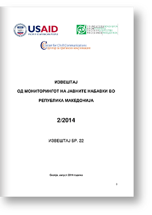 СКОПЈЕ, 4 септември 2014 година – Центарот за граѓански комуникации денеска ги објави резултатите од мониторингот на постапките за јавни набавки во Македонија, кој го опфаќа периодот од април до јуни 2014 година. Некои од клучните наоди се: