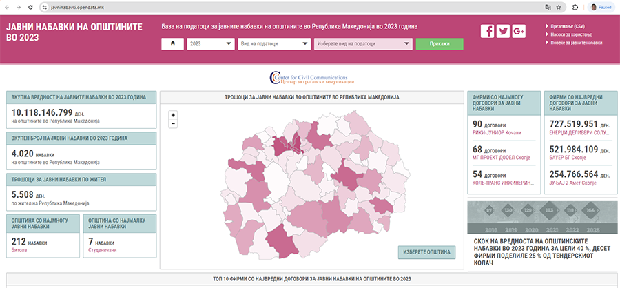– Базата на податоци за јавните набавки на општините, пак, открива дека во 2023 година, општините за набавки потрошиле 40 % повеќе пари од претходната година и дека само десет фирми добиле 25 % од вредноста на сите тендери.
