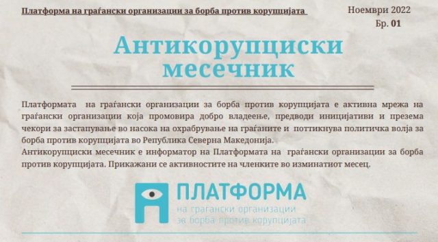 The Platform of Civil Society Organizations for Fight Against Corruption, whose member is the Center for Civil Communications, published the first Anti-Corruption Monthly for November 2022 as an informant about the activities of the members of the Platform in the past month. The platform is an active network of civil society organizations that promotes good governance, leads initiatives and takes advocacy steps in the direction of encouraging citizens and encourages political will to fight corruption in the Republic of North Macedonia.